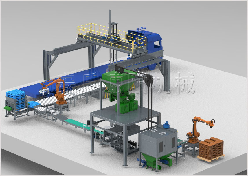 双机器人装车机工艺流程: 扫描车辆具体位置→线上或仓库(配拆垛机械手)来料→皮带输送机→多个待抓取位→移动多抓手机械手→机器人自动装车